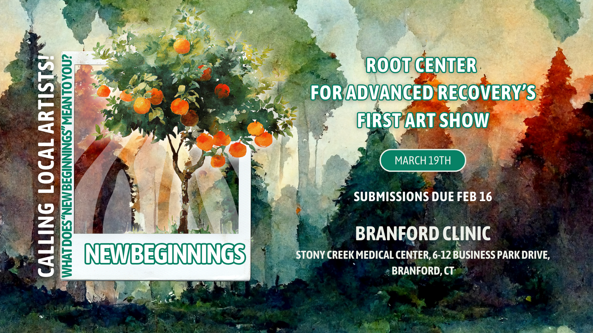 Calling all Artists! Root Center is pleased to present New Beginnings, an art exhibition celebrating recovery, hope, and renewal on the eve of the Vernal Equinox. On March 19th , Root Center will host this juried art show at our Branford location , featuring work by local artists exploring the theme of New Beginnings . Much like recovery itself, the exhibition reflects the possibility of change, growth, and redefinition. The selected works invite viewers to consider what it means to start again—whether through healing, self-discovery, or the quiet courage it takes to move forward. Timed with the return of spring, New Beginnings honors transformation as both a personal and collective experience . Artists are encouraged to interpret new beginnings broadly. The following genres will be considered: all 2D works, including, mixed media, painting, photography, drawing, collage, printmaking, illustration, graffiti, printed/recorded word. Condition: 2D works are recommended to be framed, but not mandatory. Works must be hang ready. Please do not use fisheye hooks or saw tooth hangers. For questions, please contact margaux.farrell@rootcenter.org Submission and Exhibition Date: Deadline to submit: February 16th, 2026. The exhibition will run March 19th, 2026 - June 19th, 2026. The reception will open Thursday, March 19th from 6-8pm. Accepted work: you will receive an email you art has been selected Friday, February 20th, 2026. If you art has not been accepted, you will also be notified on this date. Send Submission: In an email, please include the following: name, contact info (phone &email), and submit up to 5 photos/recordings for each work. For each piece submitted, please include: title, size (inches), price (if applicable) for each, and an artist statement for each piece. Links to additional work are also permissible. Email your submission to margaux.farrell@rootcenter.org - subject: Root - NEW BEGINNINGS Cost: The Root Center for Advanced Recovery does not charge for submissions and takes 0% commission on all artwork(s) sold. Location: Stony Creek Medical Center, 6-12 Business Park Drive, Branford, CT 06405 Submission: Please submit all pieces for consideration via email to margaux.farrell@rootcenter.org by FEBRUARY 16th, 2026 . All submissions will be responded to by February 20th. Special thanks to Alex Ranniello , MA for your collaboration as our juror on this exciting project!